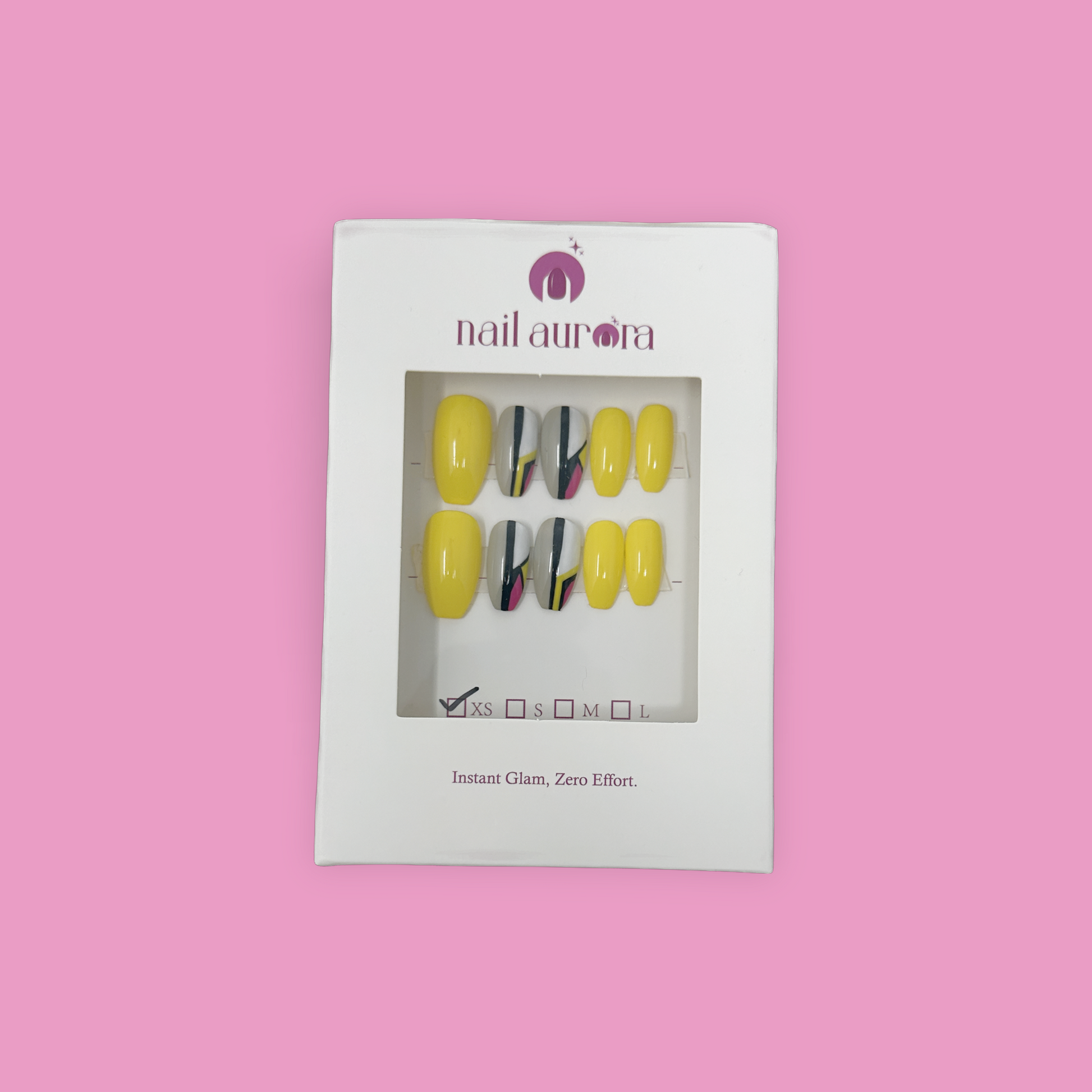 Bright yellow meets edgy black and pink linework in this sporty, vibrant press-on set. Perfect for trendsetters and creatives, these nails are lightweight, reusable, and bring serious energy to your look.